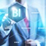 A person in a suit touches a transparent screen displaying hexagons labeled with business intelligence terms like “BI,” “data mining,” “reporting,” and “data visualization.” The background is blurred and professional.