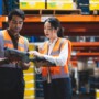 Two warehouse workers wearing orange safety vests review labor management information on tablets while standing in an aisle filled with shelves of yellow and blue storage bins.