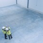 Two construction workers in high-visibility jackets and hard hats stand in an empty, spacious industrial warehouse, looking at a tablet together. The warehouse has a concrete floor and white walls.