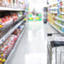A shopping cart in a grocery store aisle, surrounded by shelves stocked with various colorful packaged food items. The image is bright and the shelves are well-organized.