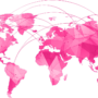 A stylized pink world map with polygonal shapes and dots, featuring curved lines connecting continents, visually represents global connections and Supply Chain Network Design & Optimization Services.