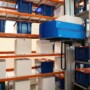 Automated warehouse system with robotic arm stacking and moving blue bins and white boxes on metal shelving units.