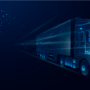 A digital illustration of a semi-truck made of blue glowing lines and geometric shapes, driving forward on a dark background with scattered light particles trailing behind it.