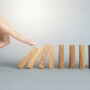 A hand is about to tip over the first of several upright wooden dominoes, illustrating a bullwhip effect chain reaction. The background is plain and light-colored.