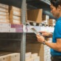 A man in a blue polo shirt uses a tablet while standing in a warehouse aisle of micro-fulfillment centers, surrounded by shelves stacked with labeled cardboard boxes.