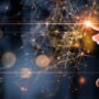 A hand reaches toward glowing, interconnected digital nodes and lines, symbolizing innovation, technology, and networking—echoing what is Microsoft Dynamics 365—against a dark, blurred background with orange light effects.