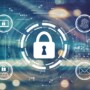 A digital illustration showing a central padlock icon surrounded by security symbols, such as a fingerprint, lock, and envelope, representing cybersecurity, security awareness training, and data protection on a blurred technological background.