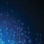 Blue glowing circuit lines and nodes rise from the bottom left against a dark background, evoking a digital or technology-themed abstract design inspired by robotics in automotive manufacturing.
