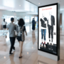 A digital billboard in a mall displays mannequins in casual clothing. Nearby, a group of people walks past, while facial recognition technology identifies their gender and estimated age on screen overlays.