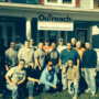 A group of men pose and smile in front of a white house with a sign reading “Outreach: Hope for Homeless Youth. Emergency Hotline (877) 614-3818.” The group stands on grass under bright sunlight.