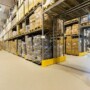 Warehouse interior with tall shelves stacked with cardboard boxes and packages. The floor is clear and clean, with wide aisles for movement. The area is well-lit with overhead lights.