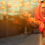 Red Chinese lanterns hang along a street at dusk, with one lantern in focus showing an illustration of a woman in traditional clothing. The background is softly blurred, filled with more glowing lanterns.