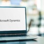 A laptop on a table displays the Microsoft Dynamics logo on its screen, with a blurred office environment in the background.