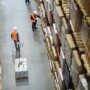 Aerial view of a warehouse aisle with two workers in safety vests and helmets; one is moving a pallet with a hand truck, while the other checks a clipboard among tall shelves stacked with boxes.
