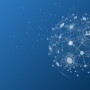 A digital globe made of interconnected lines, nodes, and icons, representing global communication and technology powered by Microsoft Business Solutions, on a blue gradient background.