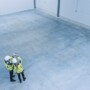 Two people in high-visibility jackets and hard hats stand in an empty warehouse, looking at a tablet as they discuss warehouse planning. The warehouse features a concrete floor and white walls.