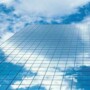 A tall glass building reflects a blue sky with white clouds, creating an almost seamless blend between the architecture and the sky above.