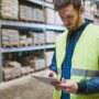 Three people in safety vests and hard hats stand in a warehouse aisle, looking at a tablet together, surrounded by tall shelves filled with boxes and supplies.